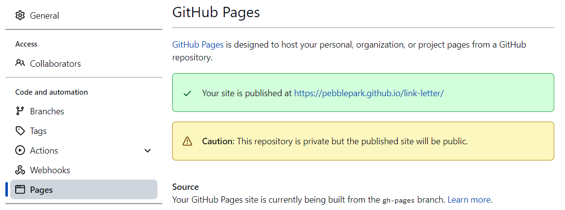 또는 깃허브 레파지토리의 Settings > Pages 메뉴로 들어가면 아래와 같이 정상적으로 배포된 것을 확인할 수 있다.
