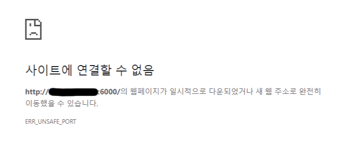 구글링해본 결과, 6000포트는 크롬에서 기본적으로 막혀있는 포트 중 하나였다. 8080 포트로 변경후 다시 접속해보니 정상 접속이 되었다.