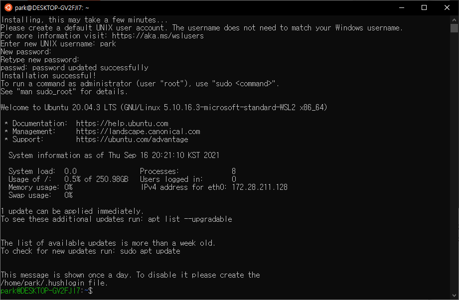 🥳윈도우에서 WSL2 설치를 완료했습니다.🥳