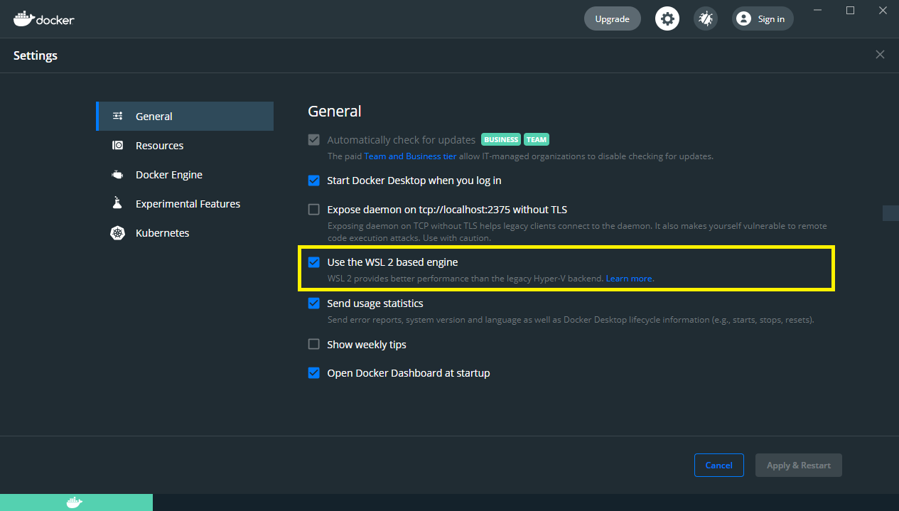 설치 후에 도커 데스크탑을 실행하여 General 탭에서 Use the WSL2 based engine 옵션이 체크되어 있는 지 확인합니다. 만약 체크되어 있지 않다면 체크해줍니다.