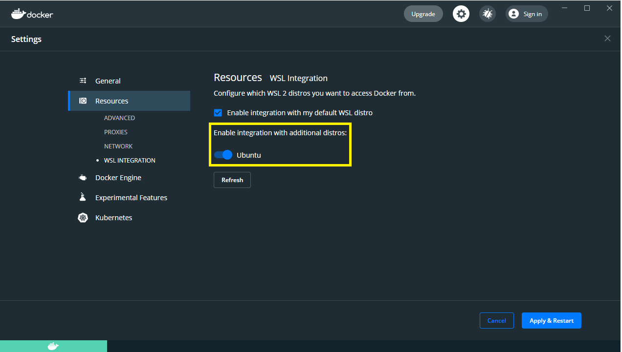 Resource -> WSL Integration 페이지로 이동 후 활성화 되어 있는 리눅스 배포판을 확인합니다. 이 전 단계에서 진행한 Ubuntu 배포판을 사용할 수 있도록 옵션을 체크한 후 Apply & Restart 를 통해 적용합니다.