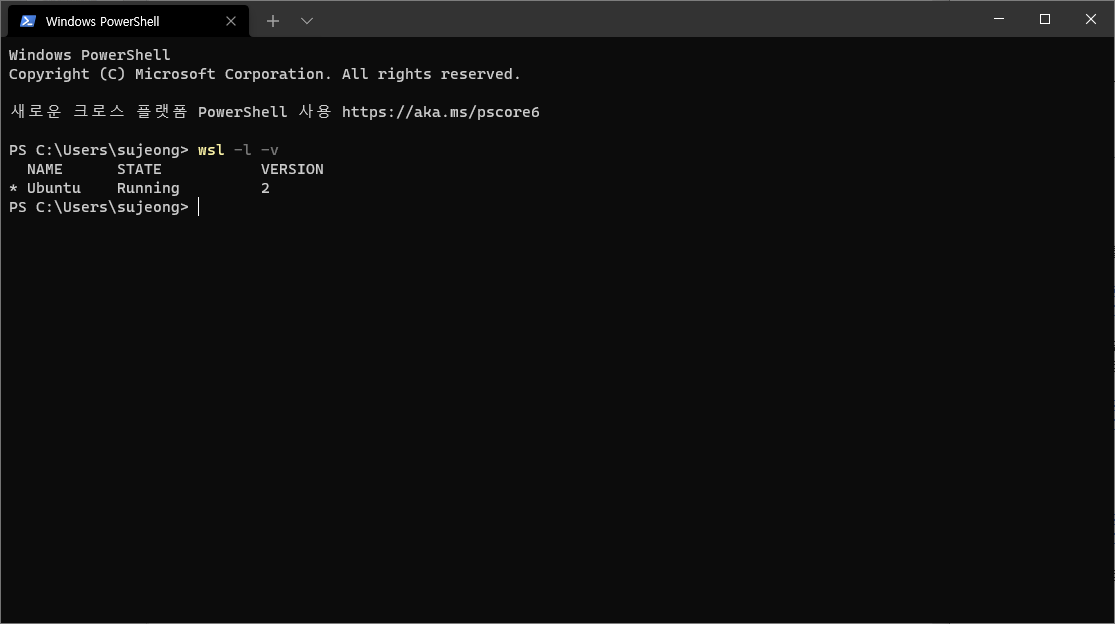 다음 명령어를 실행하면 설치된 Ubuntu가 버전 2로 잘 실행되는 것을 확인할 수 있습니다.
